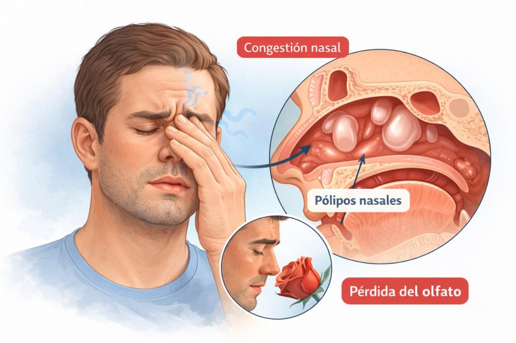Cuando los pólipos crecen, bloquean el paso del aire y pueden tapar los senos paranasales. Por eso aparece la congestión y la pérdida de olfato.